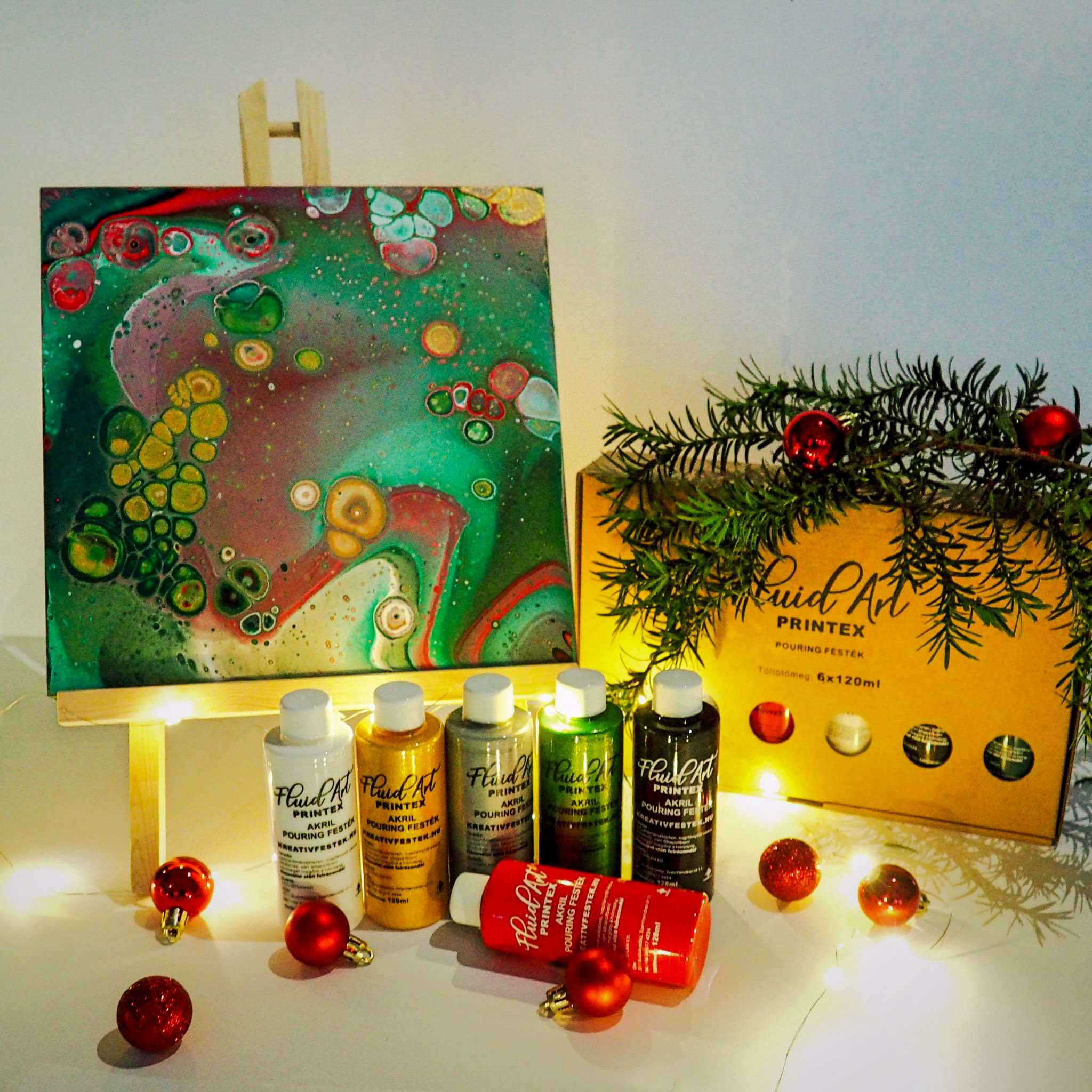 bruttóA "Ünnepi fényt" az alábbiakat tartalmazza: 6x120ml fluid art festék elegáns dobozban, + 2 MDF lap (25X25cm), + szilikonolaj
